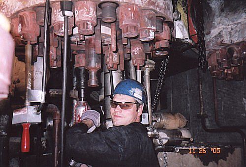 Above we see Attila's partner , Emile Bisson also obviously right at home inside these "pretty yellow machines" . The job of these two capable Millwrights is to 'change-out' these many large high-tensile studs (bolts)